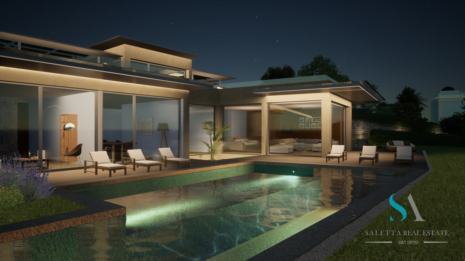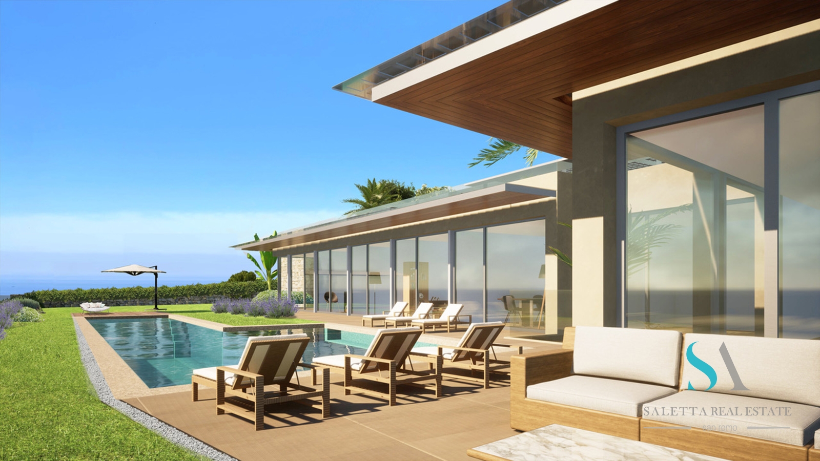 Un rifugio dove godersi lo spettacolo di luci, colori ed ombre come il blu travolgente del mediterraneo, un giardino totalmente pianeggiante che si perde nella veduta della meravigliosa baia di Ospedaletti con una piscina invitante con spazi aperti e generosi ed una terrazza pensile di oltre 200 metri quadrati per vivere momenti felici in totale relax e sentire che ogni cosa avvolge la casa come una soave protezione.